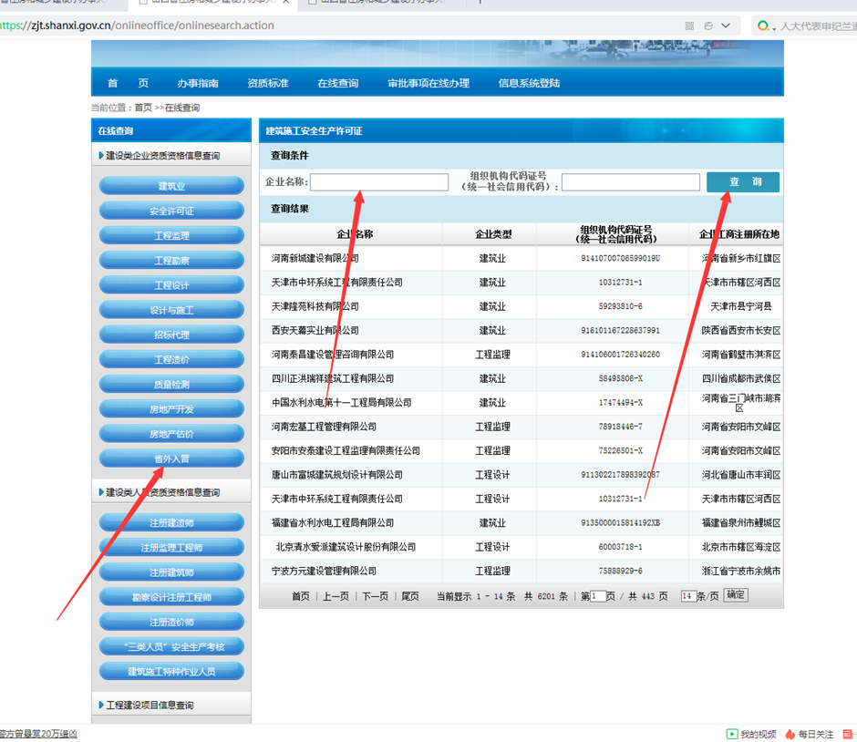 4、出现以下页面,点击省外入晋,输入公司名称,查询就可以查询到在山西的备案信息了。